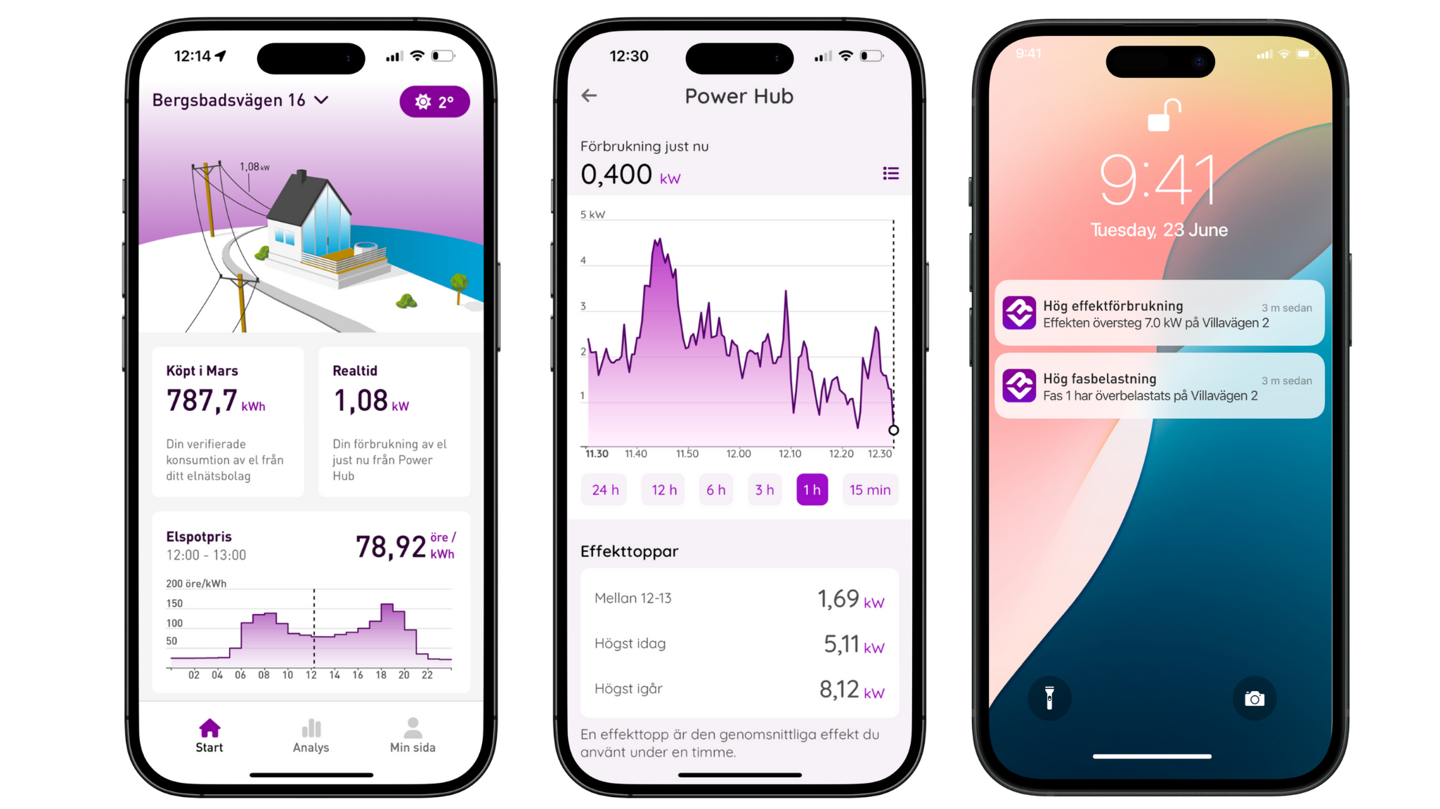 - Ställa in pushnotiser om förbrukningen går över en viss effekt