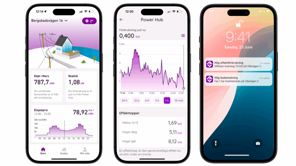 Power Hub skickar notiser till kundens telefon när effekten passerar en viss satt gräns. I appen ser användaren sin förbrukning just nu, historiskt och per tidsblock – till exempel vilken timme som varit dyrast det senaste dygnet. Med funktionen lastbalansering kan appen till och med pausa anslutna prylar i hemmet, till exempel elbilsladdningen – helt automatiskt.